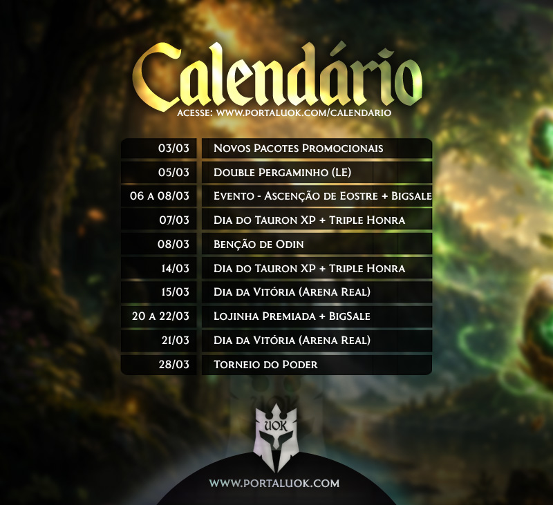 15 de março ( Domingo): O Dia da Vitória (Arena Real) consiste em um aumento da frequência das Arenas Reais Celestiais, cujo objetivo é fomentar o PvP dentro do jogo, tornando-o mais dinâmico e divertido. Confira os horários extras em nosso site no post do evento, nesta data.